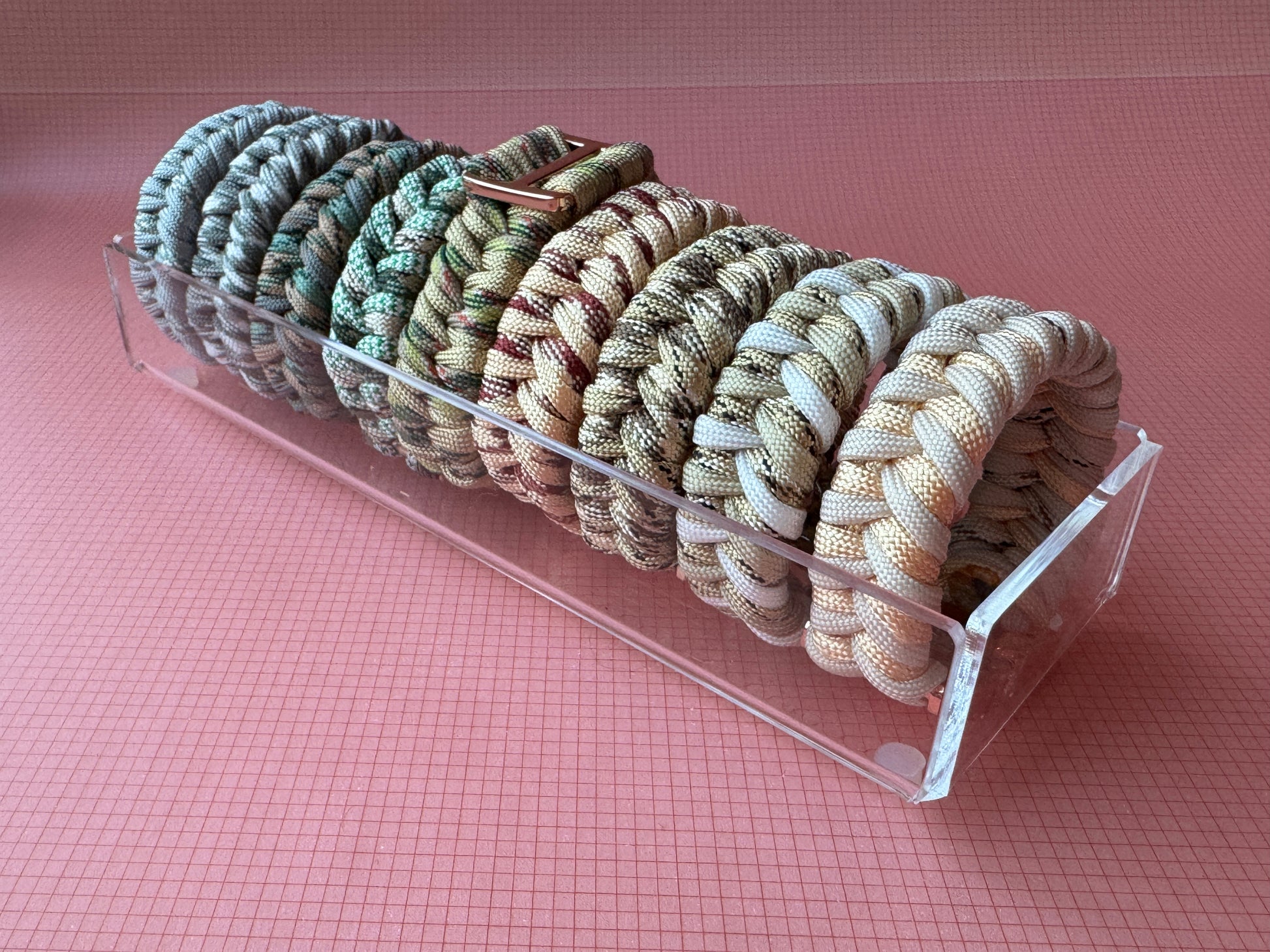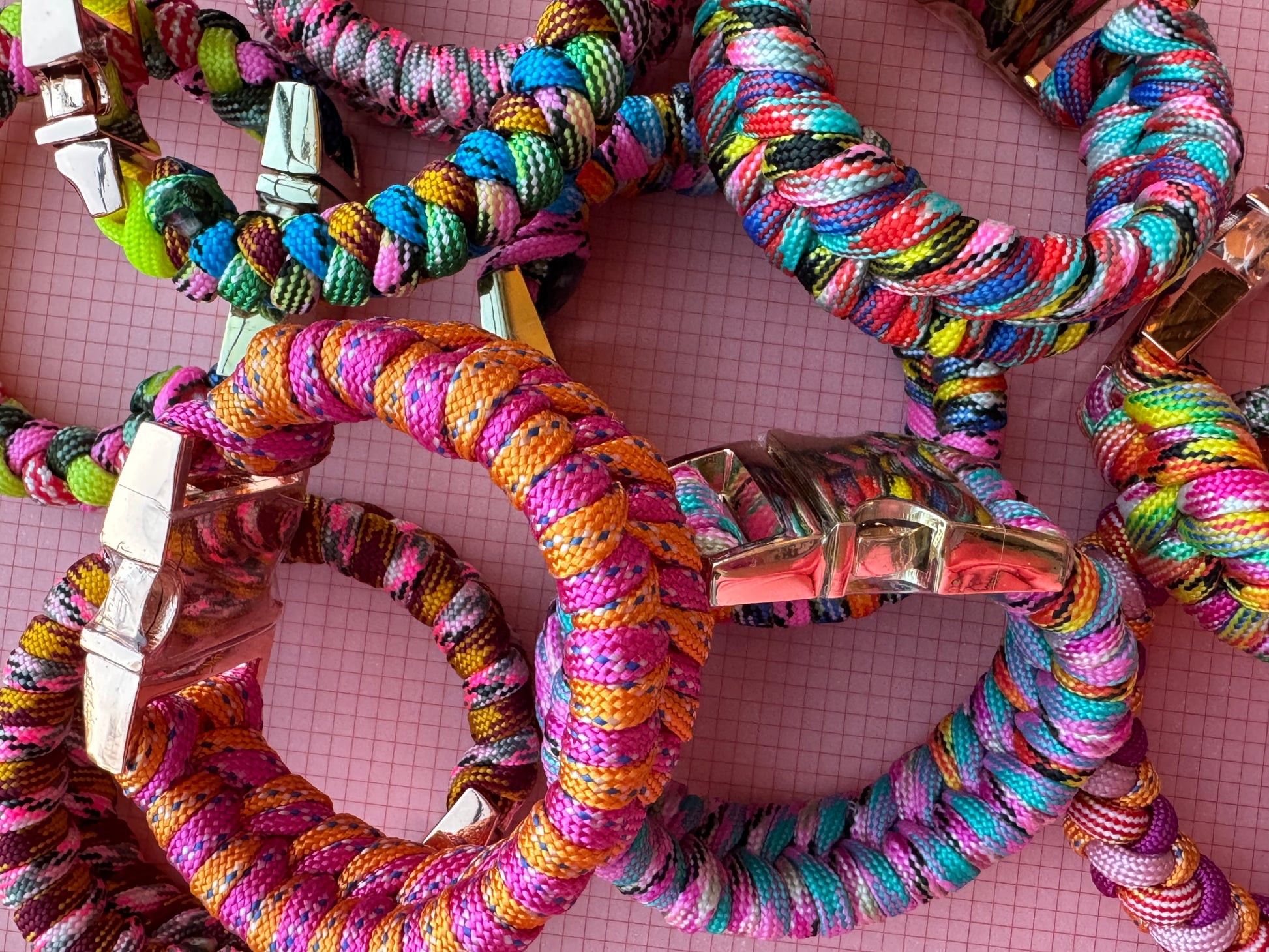 A modern take on the classic friendship bracelet. Pieces are handcrafted in Dallas with a mix of paracord finished with a sleek metal buckle clasp for a polished, elevated look. No two are exactly alike — every bracelet has its own unique pattern and character - just like your friends!